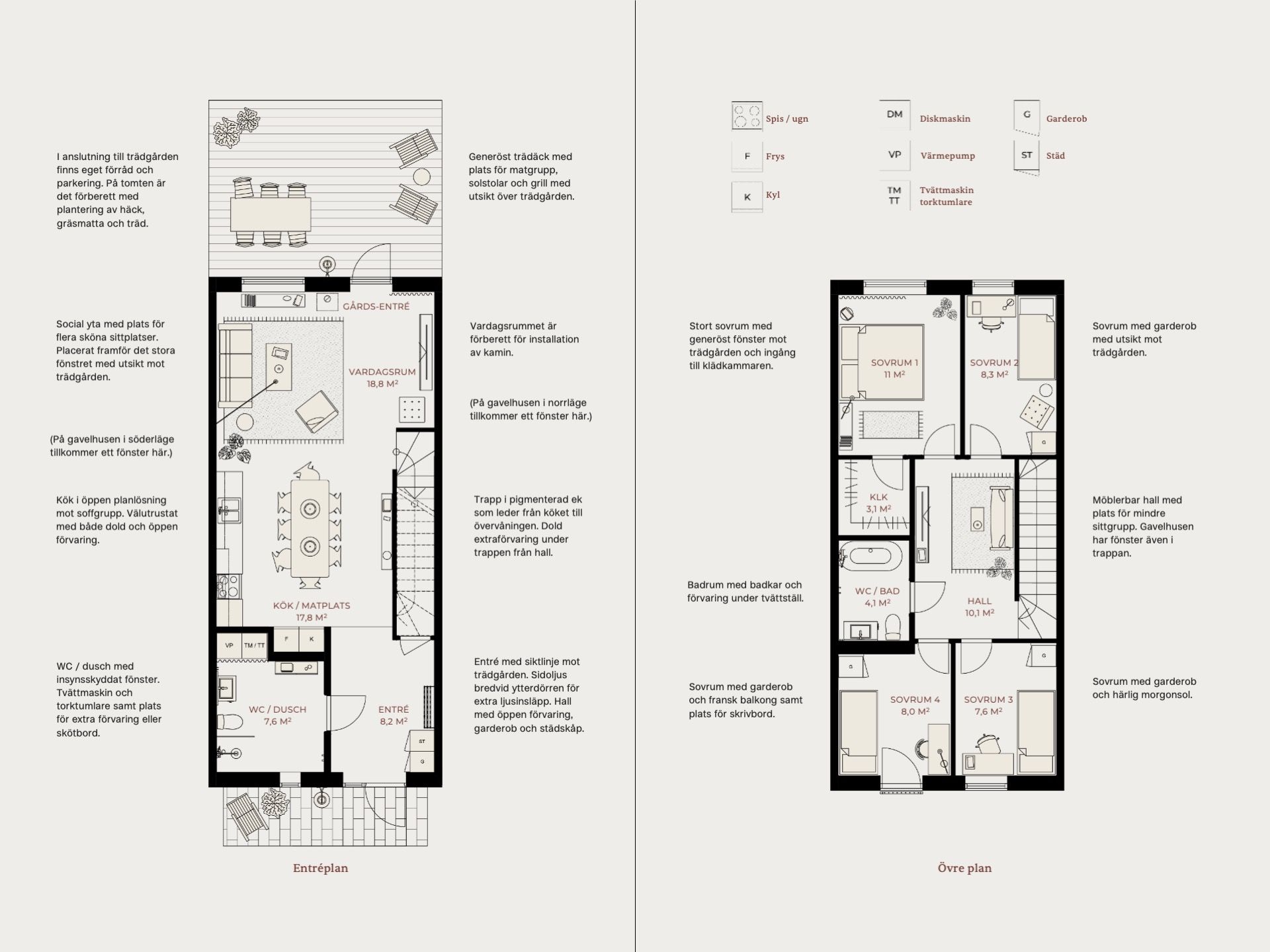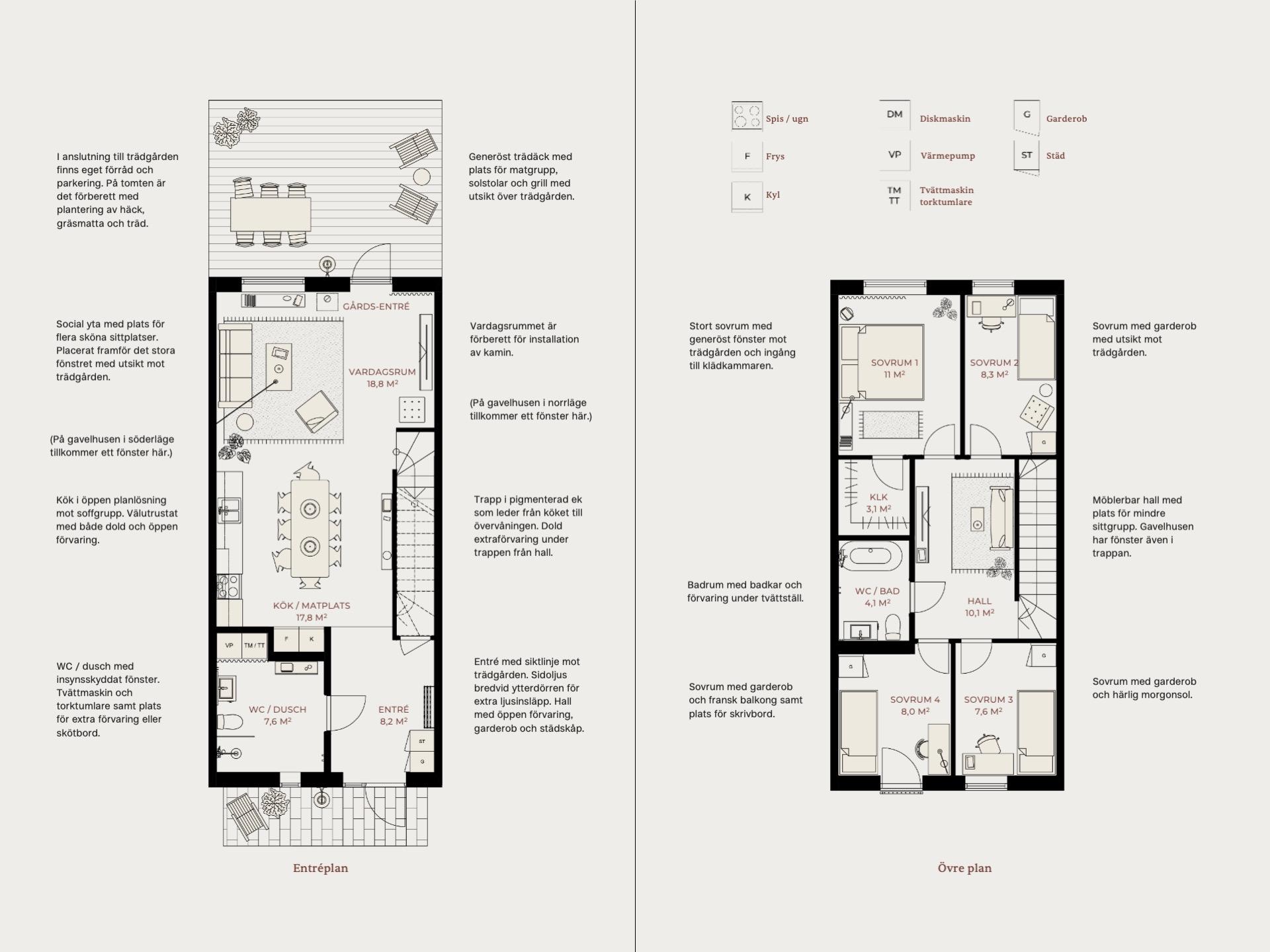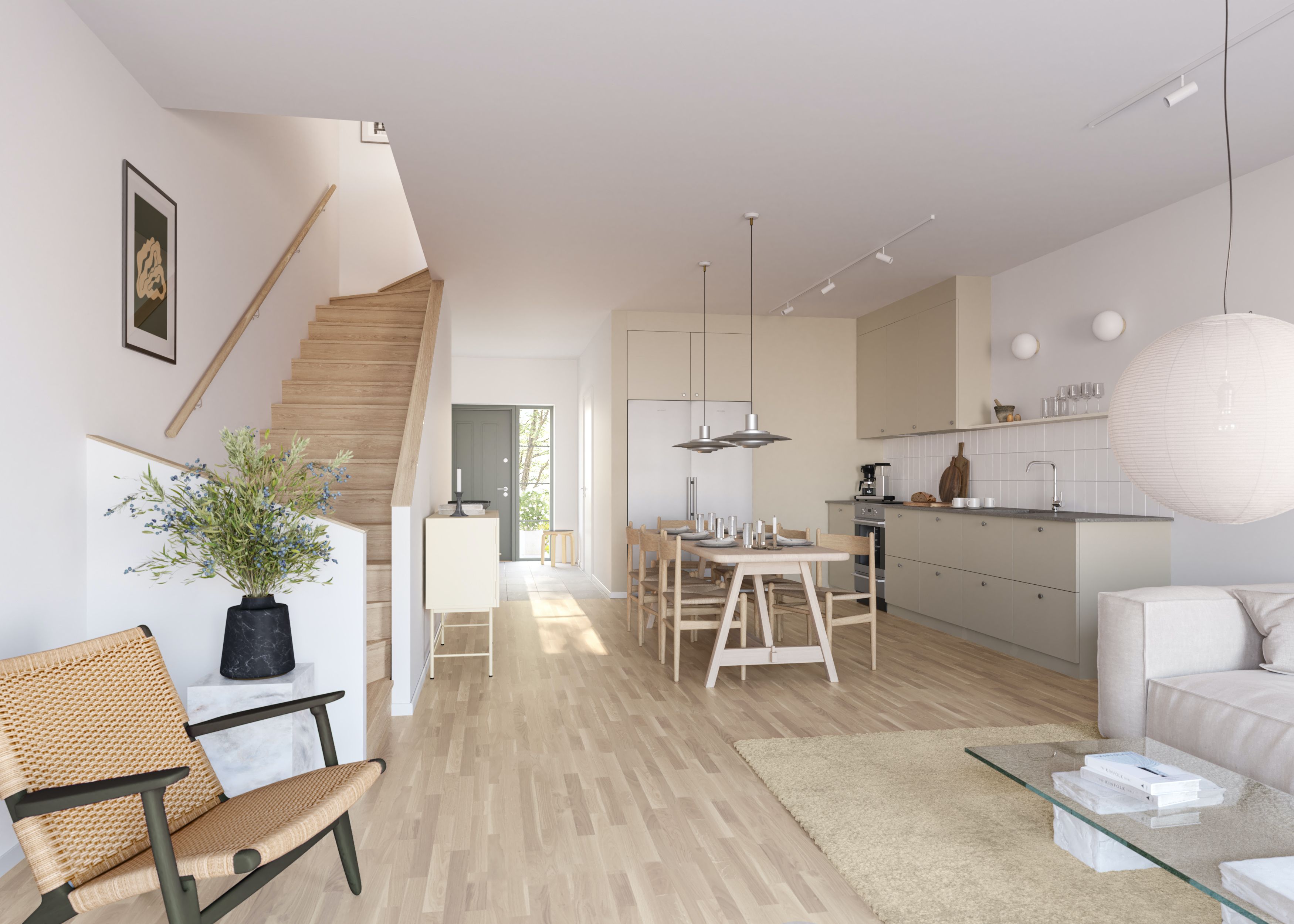 En öppen planlösning med ett välutrustat kök i anslutning till matplats och vardagsrum. Det stora dörr- och fönsterpartiet mot trädgården ger ett fint ljusinsläpp och skapar en siktlinje mellan entrén och baksidan. Entré med klinker med plats för klädförvaring samt förråd. Öppen trappa som leder till den privata delen på övervåningen med sovrum, allrum och badrum.