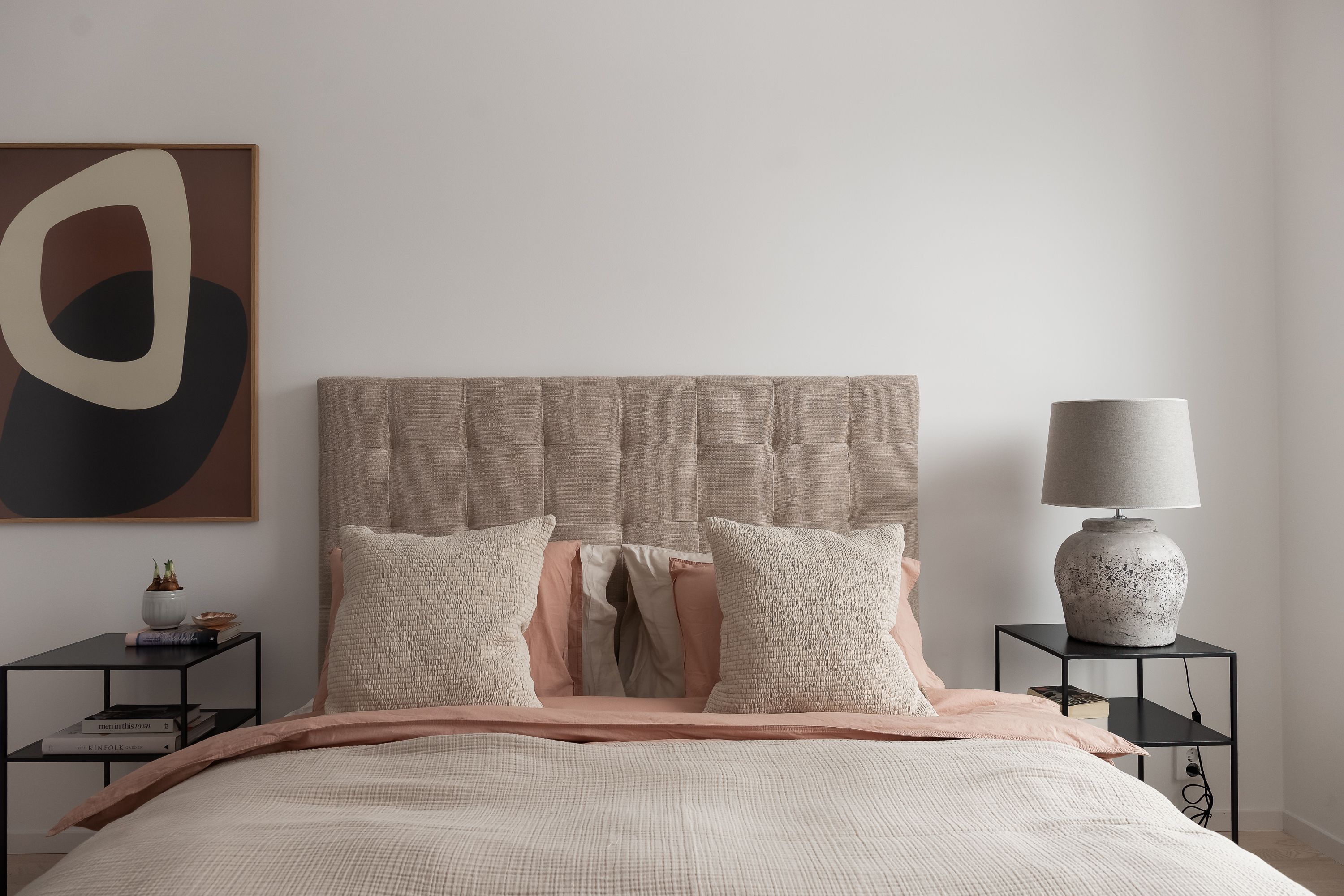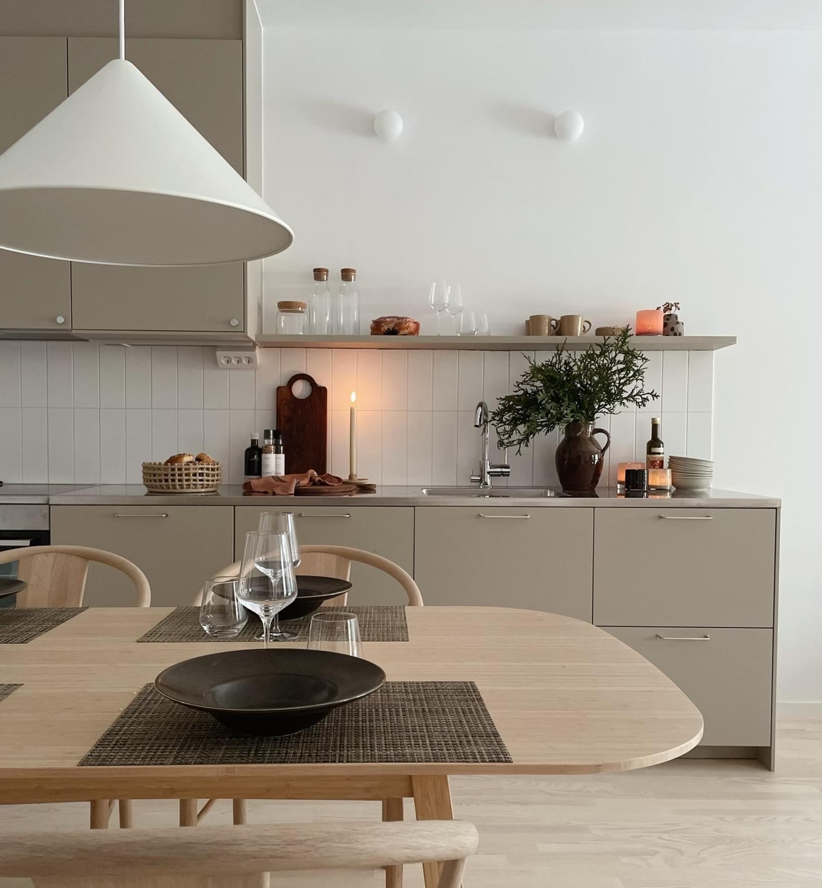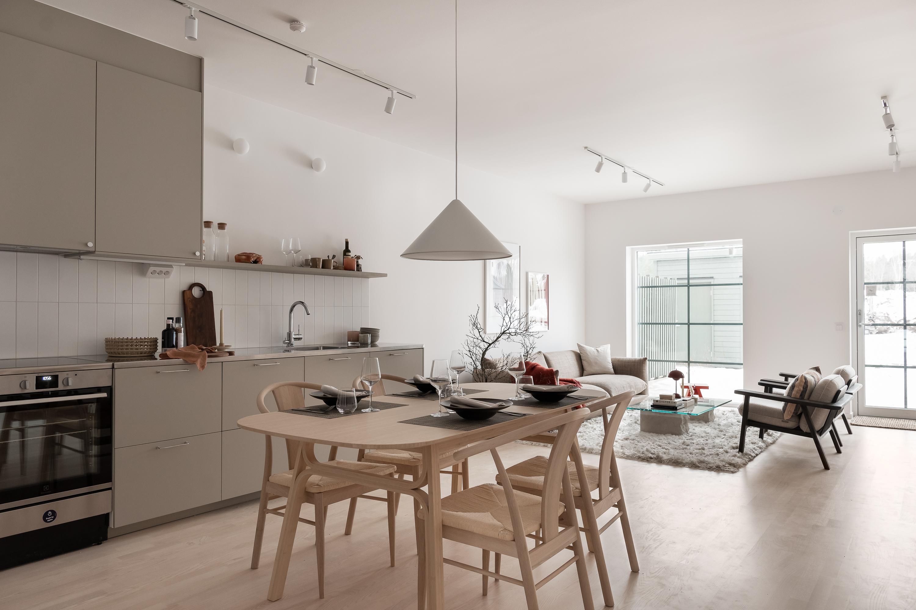 En öppen planlösning med ett välutrustat kök i anslutning till matplats och vardagsrum. Det stora dörr- och fönsterpartiet mot trädgården ger ett fint ljusinsläpp och skapar en siktlinje mellan entrén och baksidan. Entré med klinker med plats för klädförvaring samt förråd. Öppen trappa som leder till den privata delen på övervåningen med sovrum, allrum och badrum.