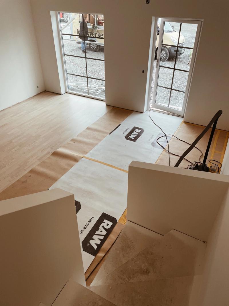 Stort och härligt vardagsrum med direkt anslutning till trädgården med högt fönsterparti samt utgång mot trädäcket. Plats för soffgrupp samt tv och kamin. Vacker genomgående parkett i vitpigmenterad ask med ekplank som tillval.